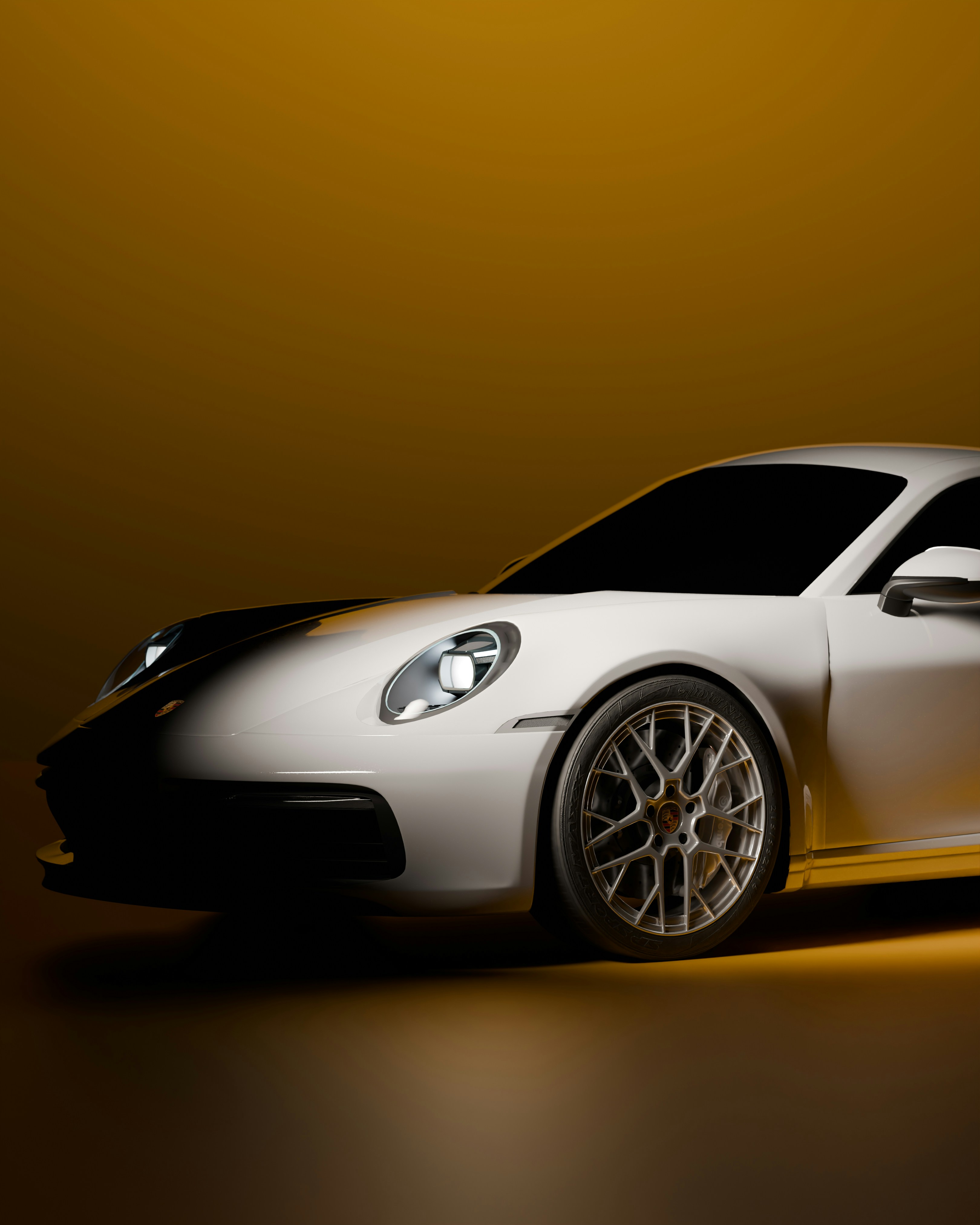 A white sports car, likely a Porsche 911, is captured in a moody and cinematic shot. The image highlights the front quarter of the car, with its headlights on and a soft glow on the tires, set against a dark, golden-brown background.
