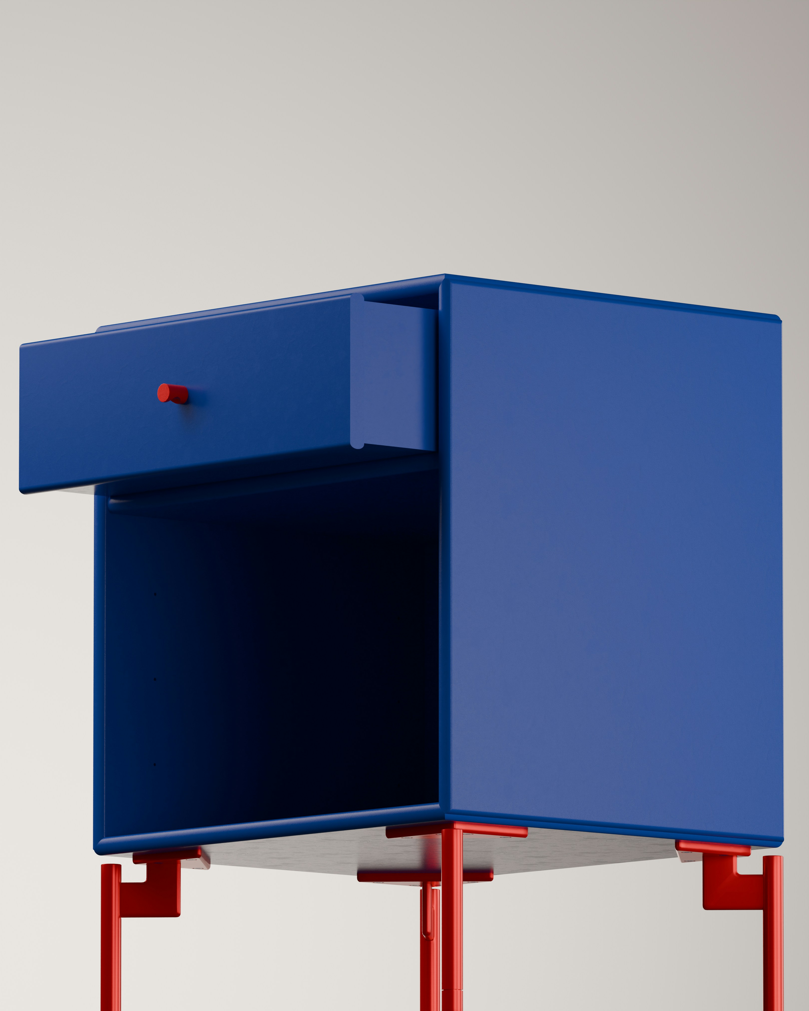 A vibrant blue bedside table or nightstand with a drawer and an open shelf, set on playful red legs. The contrasting colors and minimalist design give it a modern, almost Mondrian-esque aesthetic.