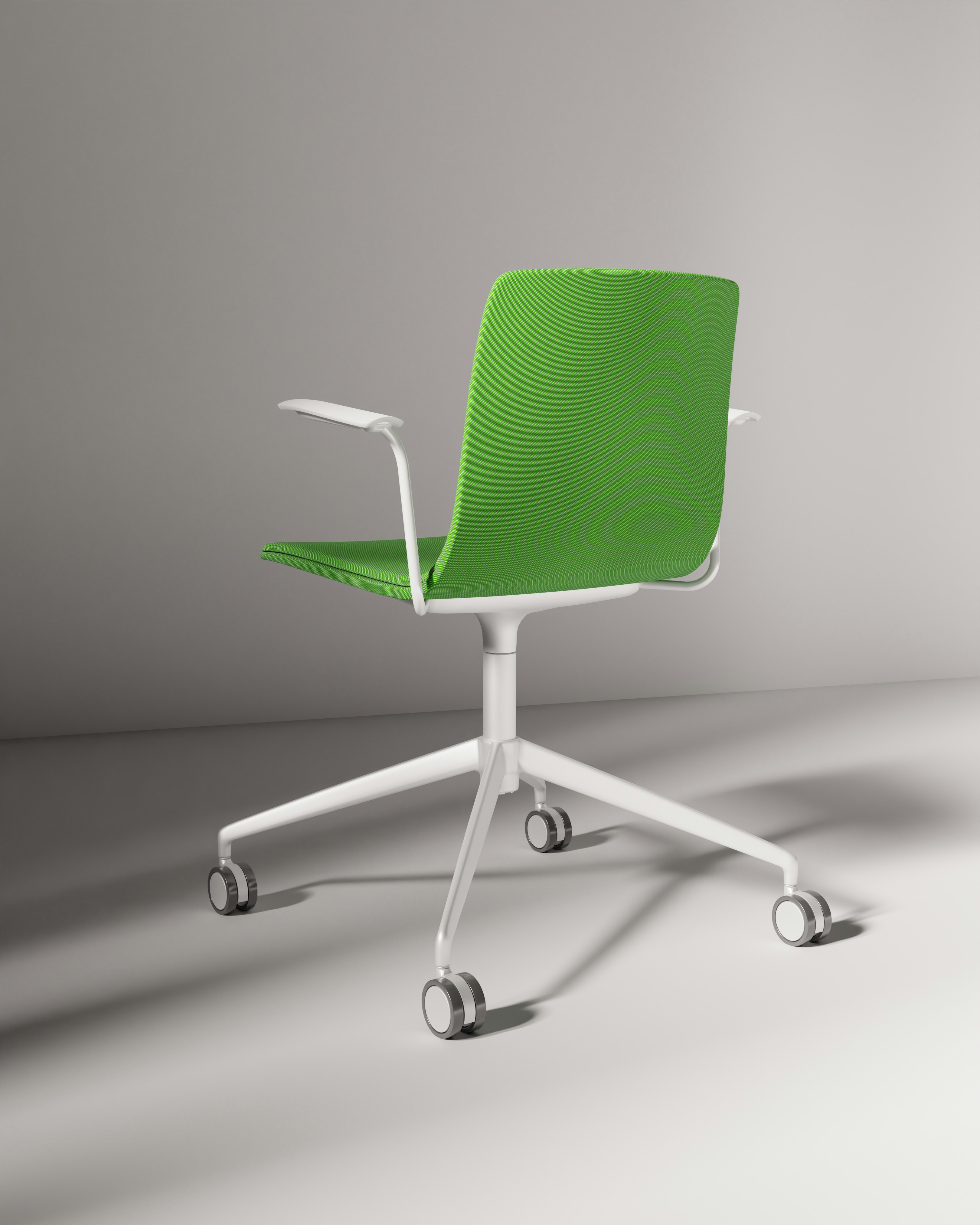 A modern bright green office chair with a dynamic backrest and seat design, featuring white armrests and a sturdy wheeled base. It brings a vibrant pop of color and a fresh feel to any workspace, while offering comfort and support.