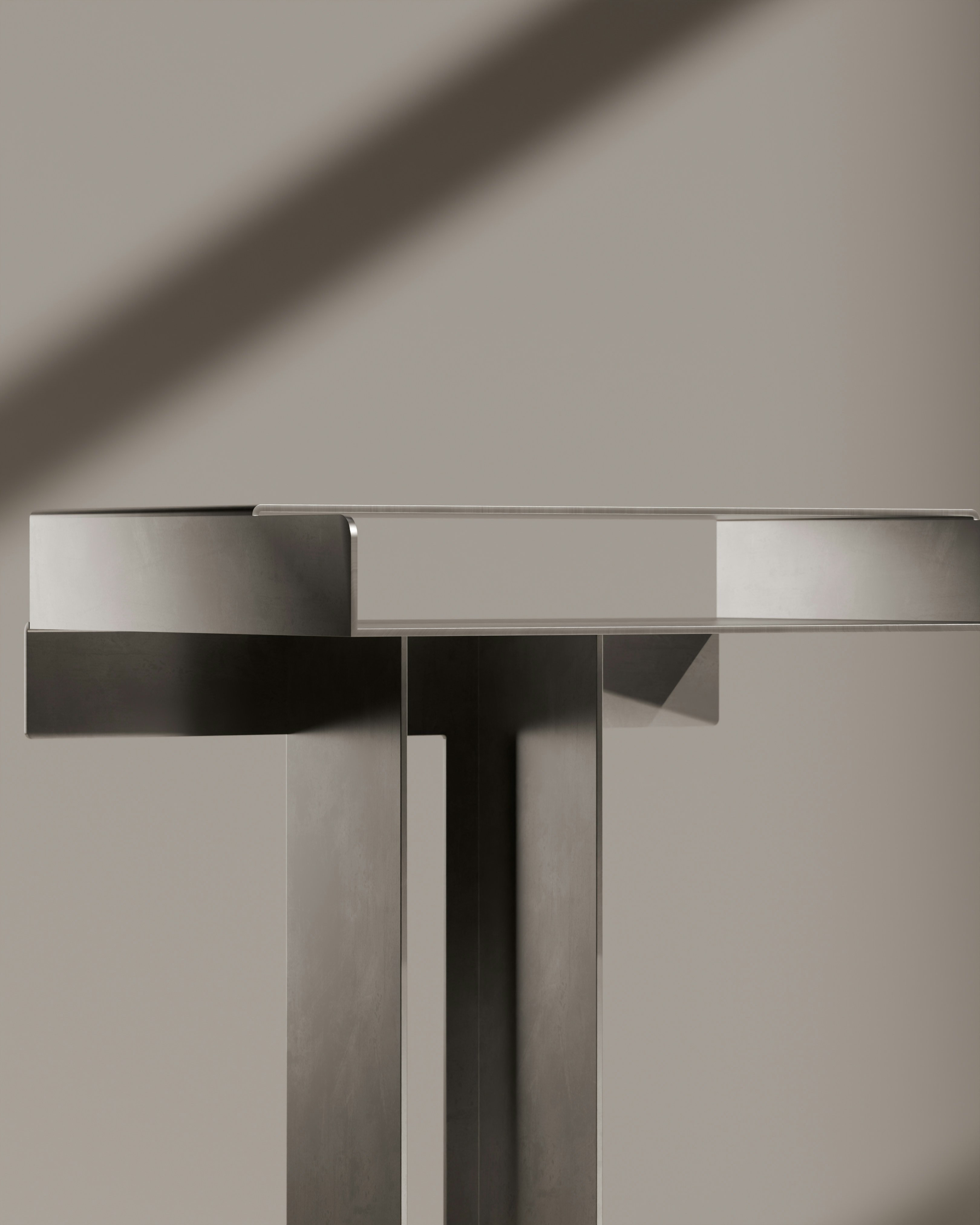 A close-up, horizontal view of the top portion of a brushed metallic side table, revealing the refined finish and the interesting interplay of its flat and slightly raised surfaces. The subtle reflection and light create visual interest on the minimalist form.