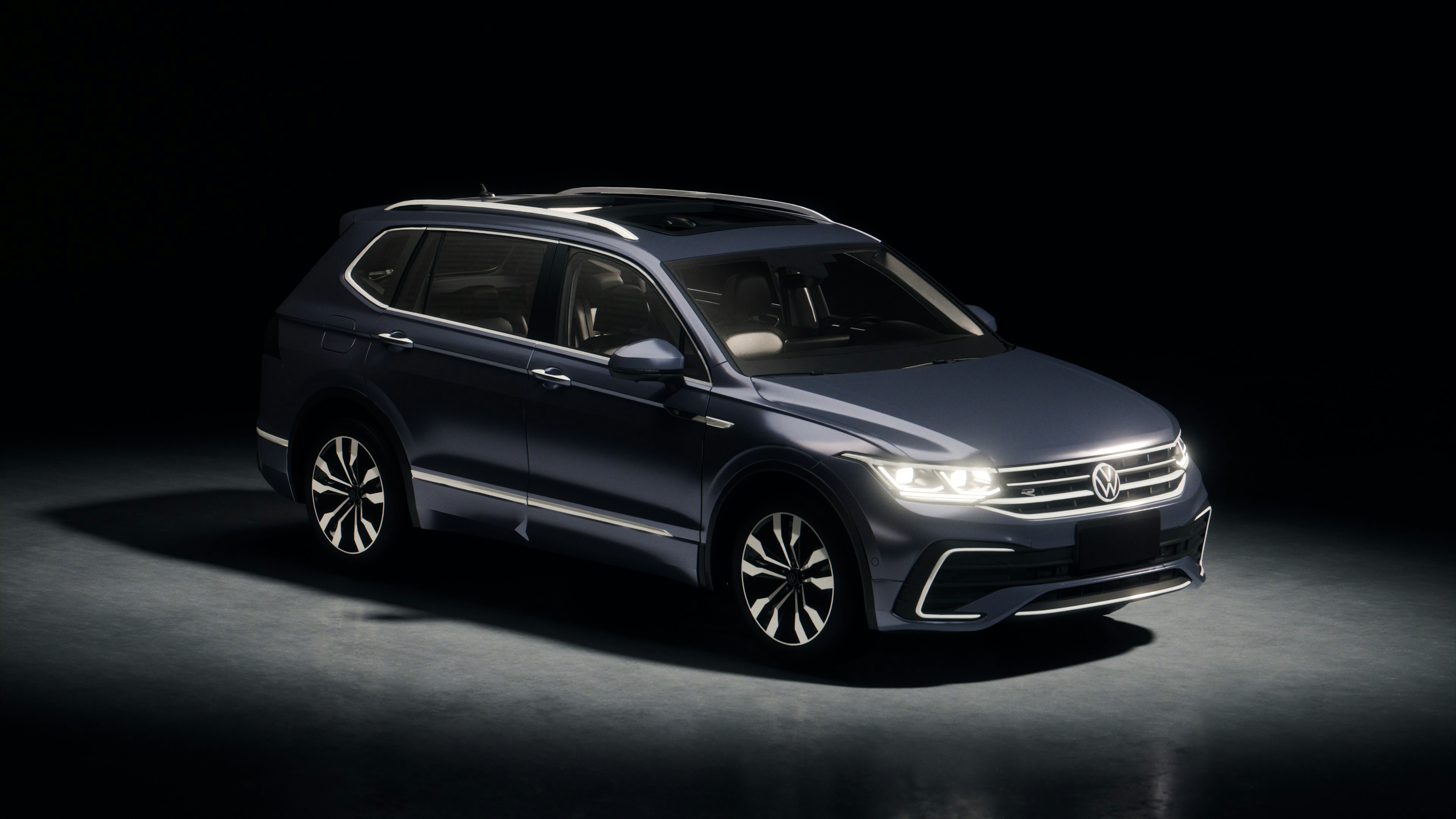 A striking three-quarter front view of a dark-colored Volkswagen Tiguan SUV. The image focuses on the car's dynamic posture and illuminated headlights, with a strong emphasis on the glossy, reflective surfaces of the exterior against a low-key, dark background.